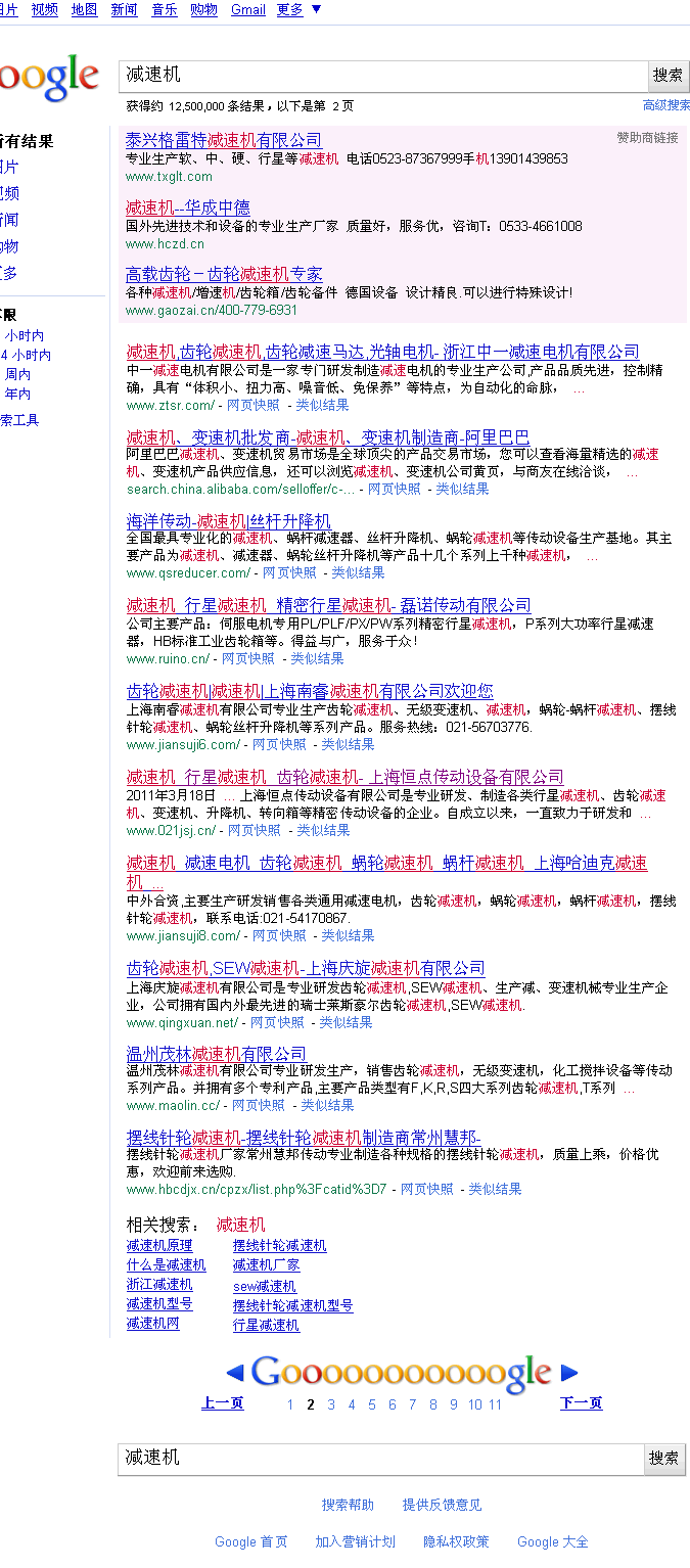 最近,公司網站排名上升瞭一些。輸入關鍵詞“減速機”,本公司網站在谷歌的結合排名在第16位,目前位於搜索結果的第二頁中間。随著公司業務的提升,網站會有更好的排名。也謝謝各位朋友對本公司支持與幫助 ,謝謝。