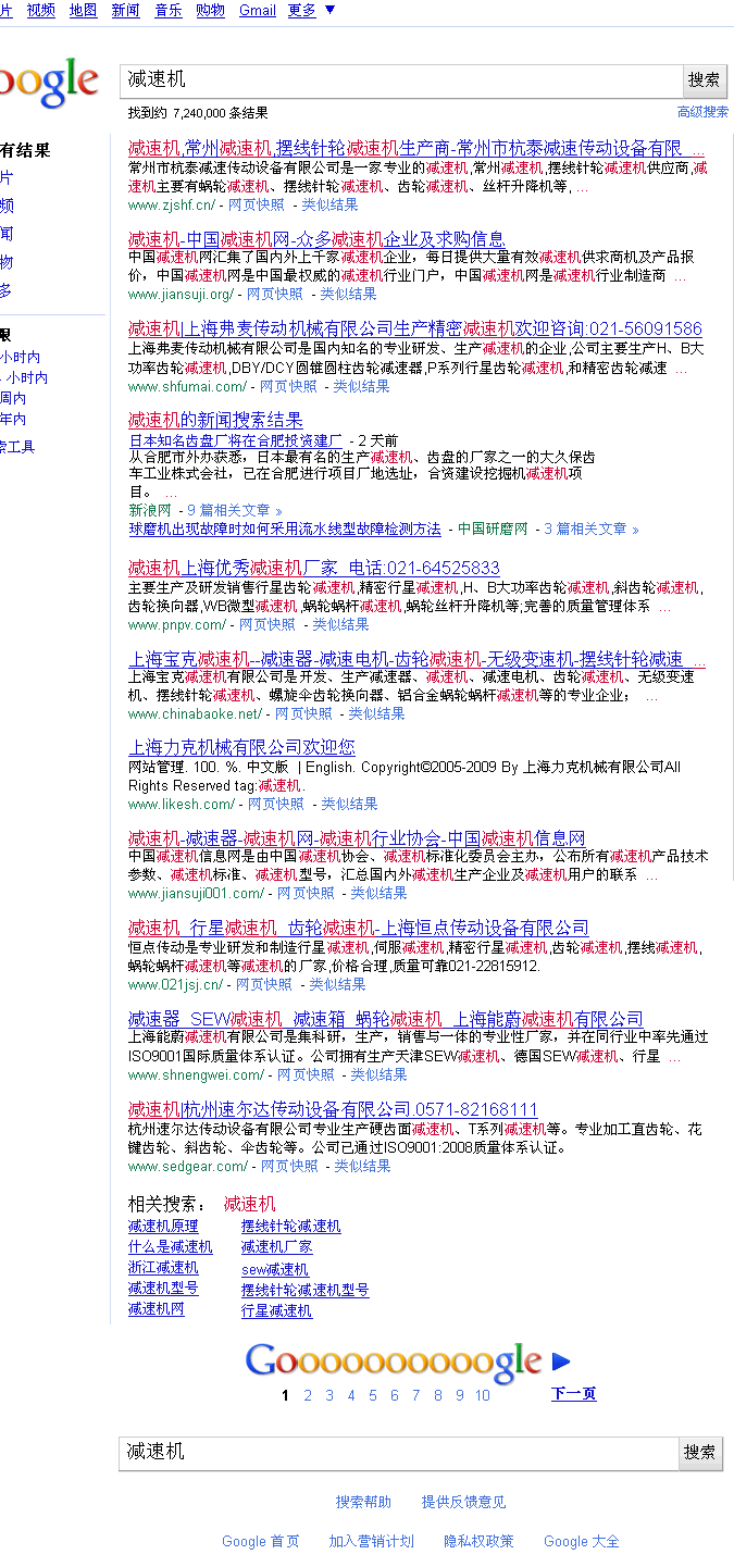 谷歌搜索引擎對本公司網站的收錄做瞭更新,輸入“減速機”,現在排名第八位 ,位於首頁下方。