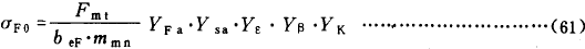 齒根應力基本值σF0是以載荷作用於齒頂爲計算基礎,然後利用重合度系數Yε,将齒頂加載時名義齒根應力轉換爲單對齒齧合區上界點加載時的值,再考慮螺旋角的影響及錐齒輪特點後得出的。由下式確定: