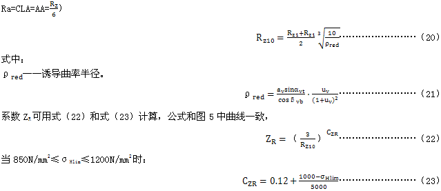 根據14.2的規定 ,粗糙度系數ZR是考慮齒面狀況對接觸疲勞(點蝕)強度的影響。圖5中的粗糙度系數曲線是Rz10和配對齒輪中較軟齒輪材料σHlim的函數 。該圖對節點處誘導曲率半徑 的齒輪副是有效的。