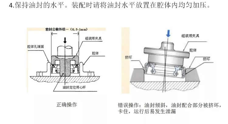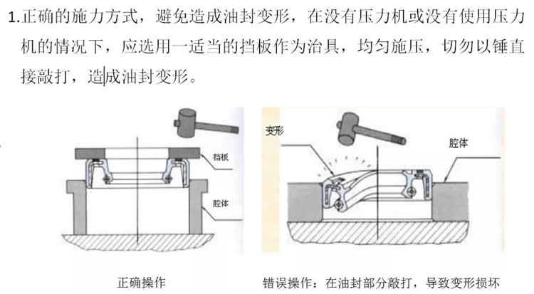 2.油封要平裝,不能有傾斜的現象 。建議採(cǎi)用油壓設備(bèi)或套筒工具安裝 。壓力不要太大,速度要均勻、要慢。