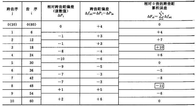 計算結果給出瞭相對0#齒的跨齒齒距累積誤差的最大值ΔFpj max=+10 和最小值ΔFpj min=-11。爲瞭求得ΔFpj max應對i=12~18、i=18~24進行逐齒補點測量。爲瞭求得ΔFpj min應對i=42~48、i=48~54進行逐齒補點測量。補點測量數據的處理方法列於表4、5、6、7。