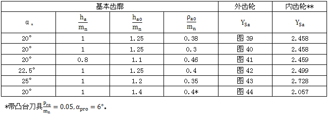 與圖39至44各齒形參數相應的内齒輪應力修正系YSa也可由表20查取 。