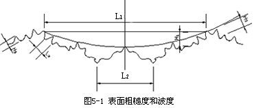 加工表面的微觀幾何特征主要包括表面粗糙度和表面波度兩部分組成,如圖 5— 1所示。表面粗糙度是波距 L小於(yú) 1mm的表面微小波紋;表面波度是指波距 L在 1~ 20mm之間的表面波紋。通常情況下,當(dāng) L/H(波距 /波高)﹤ 50時爲表面粗糙度, L/H=50~ 1000時爲表面波度。