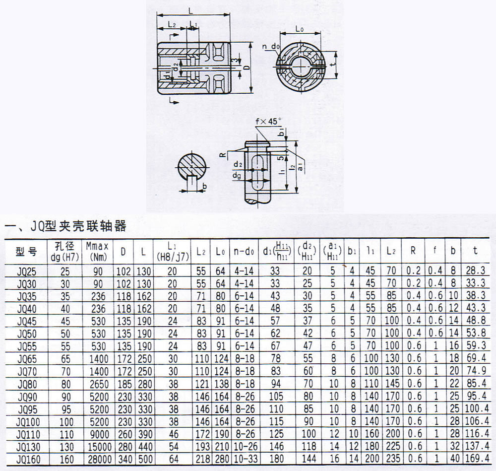 JQ型夾殼聯軸器有如下型号:JQ25,JQ30,JQ35,JQ40,JQ45,JQ50,JQ55,JQ65,JQ70,JQ80,JQ90,JQ95,JQ100,JQ110,JQ130,JQ160.