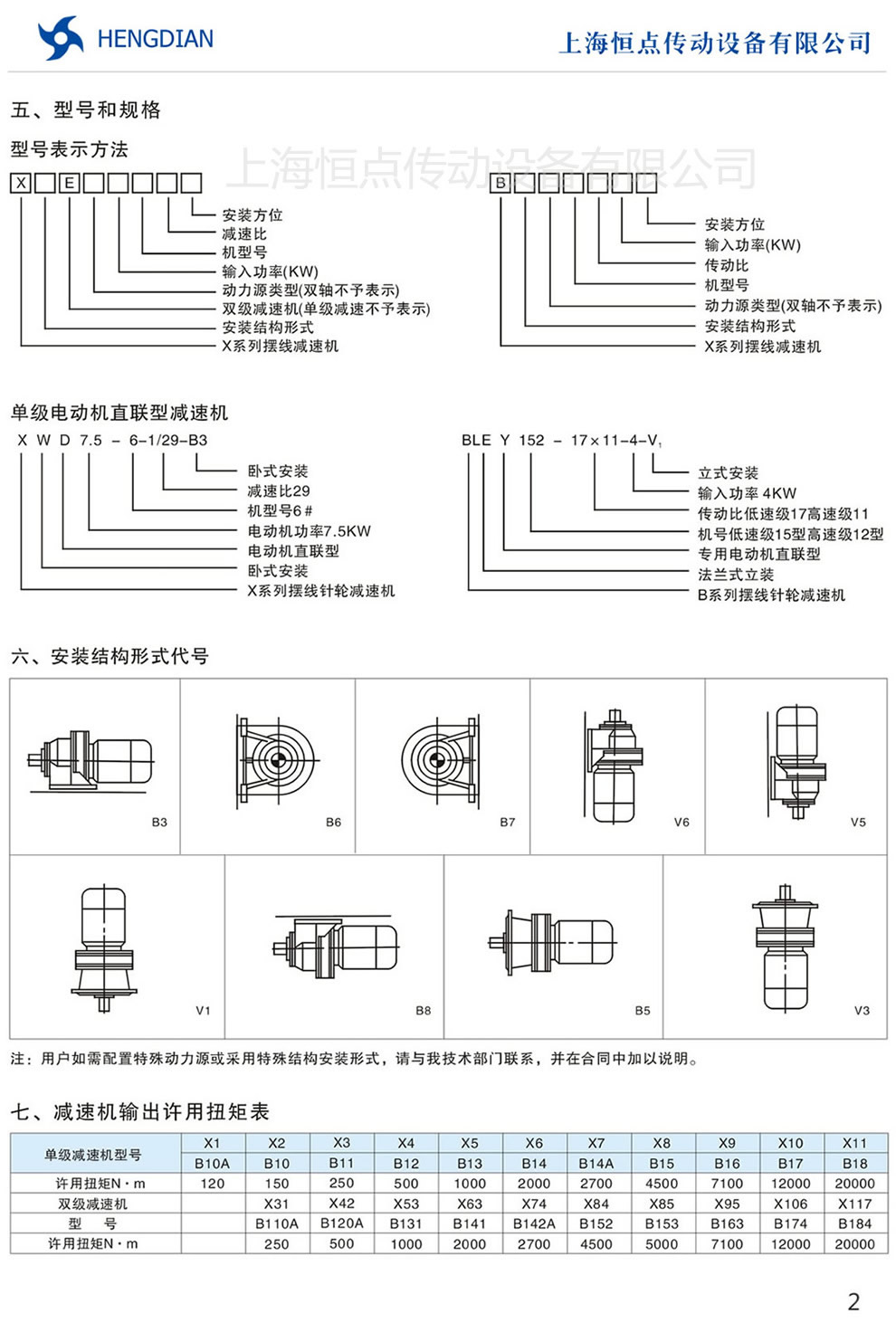 3 - X/B系列減(jiǎn)速機(jī)輸出許用扭矩表 4 - 單級,雙級擺線減速機型号規格選擇表