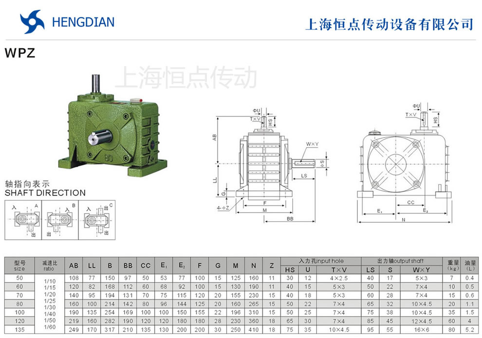 WPZ蝸輪蝸杆減速機的外形尺寸及安裝尺寸,WPZ減速機軸輸入,軸輸出.WPZ減速機軸指向表示方法.機座号從50到135,可選速比從10到60.WPZ系列蝸輪蝸杆減速機選型指南
