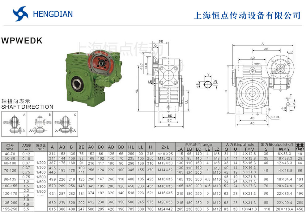 WPWEDK雙級萬能減速機的外形安裝尺寸.WPWEDK雙級蝸輪蝸杆減速機選型指南,WPWEDK雙級減速機法蘭輸入,孔輸出.WPWEDK減速機機座号40-70到155-250,速比200到900.